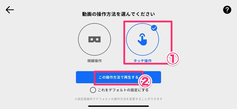 DMM VR動画で見たいVRを選んだら「タッチ操作」を選択して「この操作方法で再生する」を選びます。